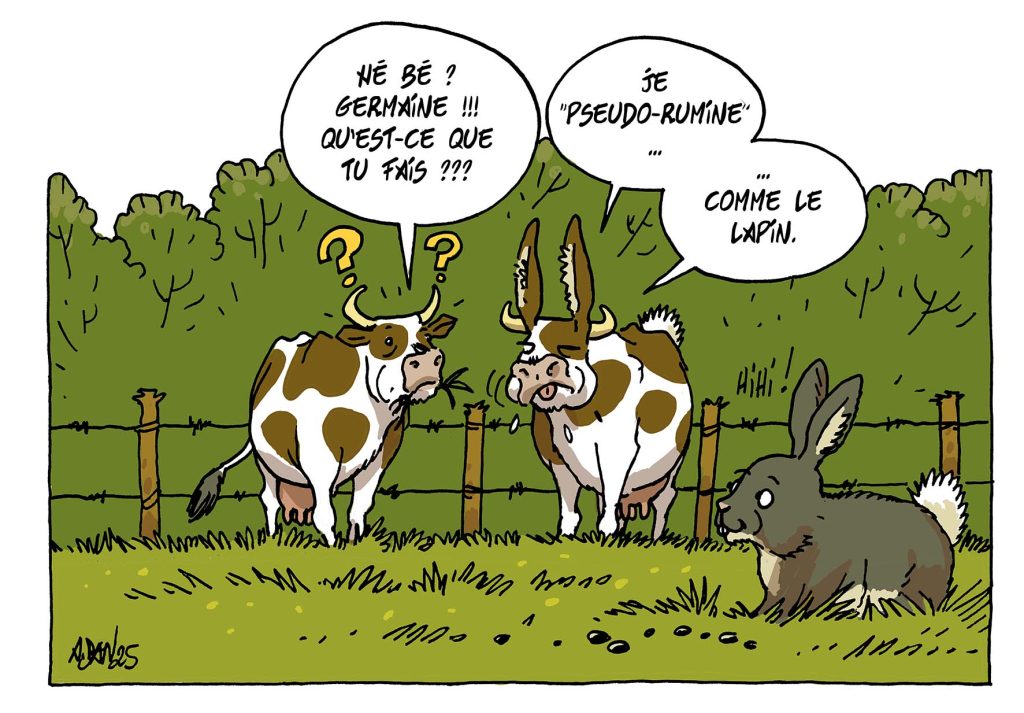 Environ 80 % des mammifères sont herbivores. Parmi eux, ceux qui ne sont pas ruminants ont, pour la plupart, du mal à dégrader le constituant principal de l’herbe, à savoir la cellulose. Les lapins ne sont pas des ruminants. Pour autant, ils disposent d’un système efficient qui leur a autrefois valu le qualificatif de « pseudo-ruminants ». Leur tube digestif court, 4,5 à 5 mètres chez l’adulte, comporte deux réservoirs, l’estomac et le cæcum (prononcer « sékomme »), qui renferment à eux seuls jusqu’à 80 % du contenu total du tube. Une valvule permet au bol alimentaire de progresser soit vers le cæcum, soit vers la suite du tube digestif. Le cæcum est à l’origine de crottes molles, les cæcotrophes, que les lapins ingèrent pour redigérer leurs aliments. Les lièvres, les musaraignes, les marmottes, les castors, et les chinchillas sont quelques-uns des autres herbivores à pratiquer la cæcotrophie.