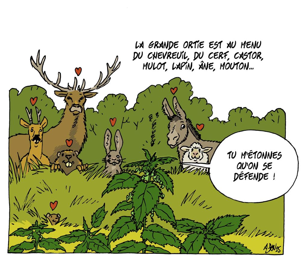 Oiseaux, escargots, mammifères… elles sont essentielles à énormément d’animaux, à la fois comme ressource alimentaire et comme habitat. En témoigne l’analyse des semences contenues dans leurs déjections, la Grande ortie est abondamment consommée par le Cerf élaphe, le Chevreuil, le Lapin commun, le Mulot des bois, ou encore le Castor européen. Et par les animaux domestiques, aussi : 70 % des semences retrouvées dans le crottin de l’Âne et 80 % de celui du Mouton commun correspondent à des orties ! En Europe centrale et méridionale, on considère que plus de 100 espèces d’insectes sont liées aux orties.